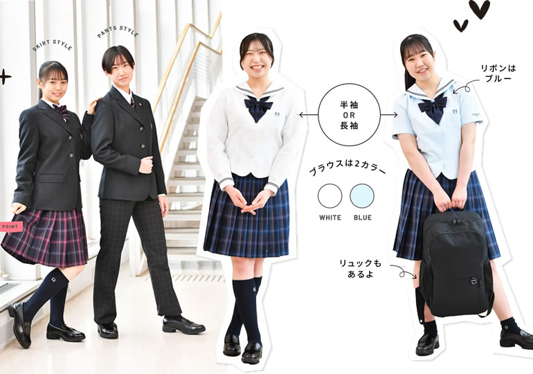 制服はOLIVE des OLIVEブランドで、4色のカラーのブラウスや、夏服のセーラーカラーが好評です。