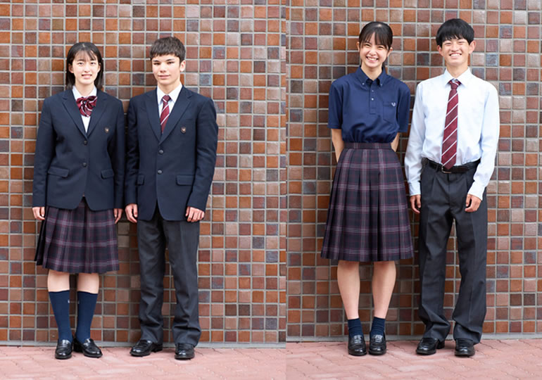 男女共に、濃紺のブレザーの胸ポケットにはUJ マークのエンブレムがアクセントになっています。