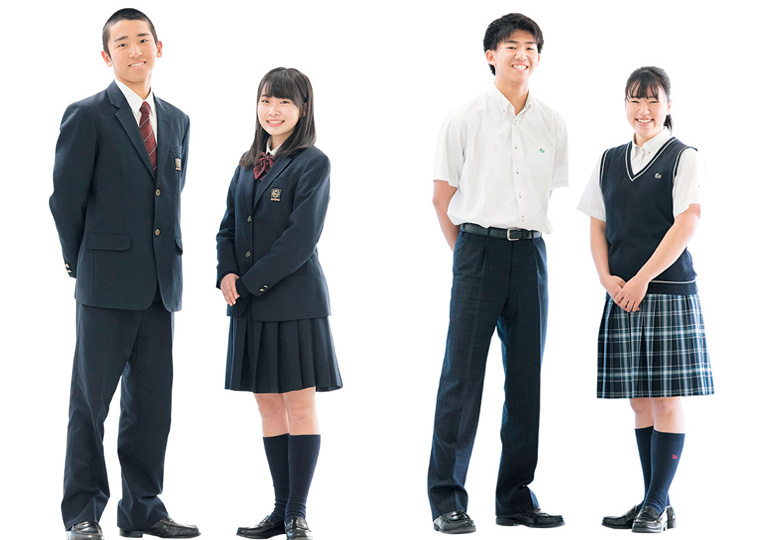 夏服:男女共にボタンダウンのシャツにスラックス、スカートが基本。女子は、正式である濃紺のスカートの他にサブスカートとしてタータンチェック柄を選択することもできます。また、シャツの上に紺色のニットベストを着用します。