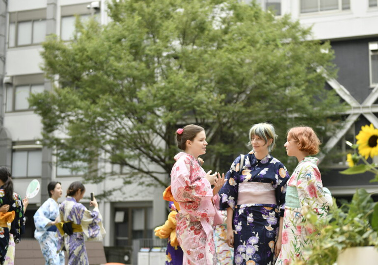 外国語教育に定評があり、多言語・多文化が共生する環境です。全学生の約1割が留学生で、キャンパス内では日常的に多様な言語が飛び交っています。