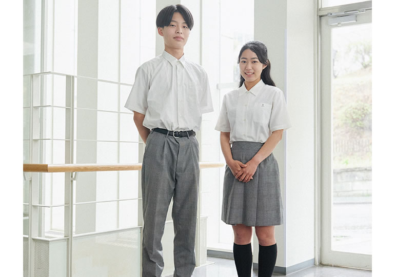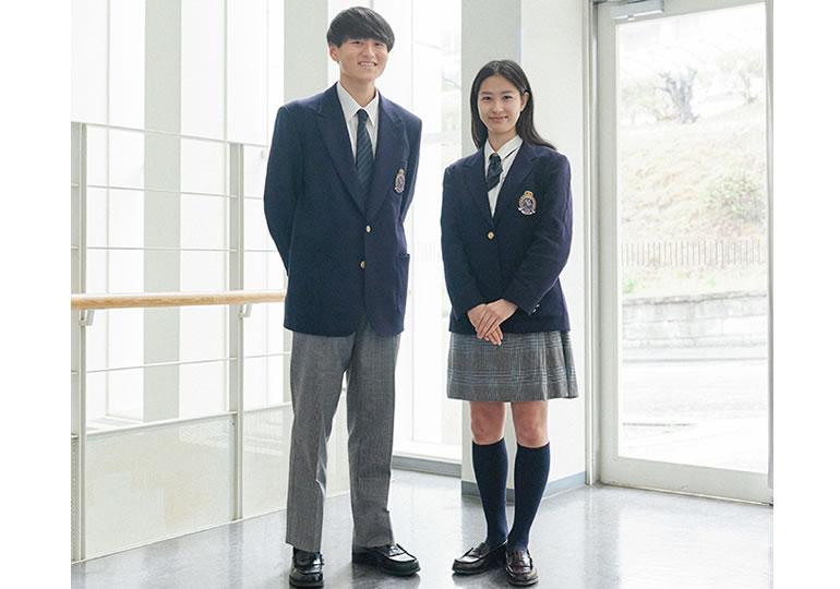ネイビーブルーのブレザーに男子はグレンチェックのズボン、女子はグレンチェックのスカートです。ネクタイ・リボンは中学生が赤と紺・高校生が緑と紺のストライプです。