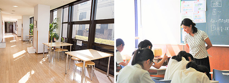 職員室の前には、机といすがあり、いつでも相談ができるようになっています。先生と生徒の距離が近く、面倒見が良いのが特徴です。