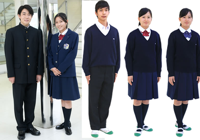 男子はストライプの織柄の黒の詰襟。 女子は胸にエンブレムの光る紺のブレザー上下に、 同色のベストを合わせ、 エンジのリボンタイを結ぶ上品なスタイル。春先や秋の初めなどは、 男女とも紺のセーターを組み合わせることもできます。女子は、 グレーのスカート、ブルー×レッドのストライプのリボンタイ、 夏用オフホワイトのベストが用意されています。スクールソックスは白または紺です。
