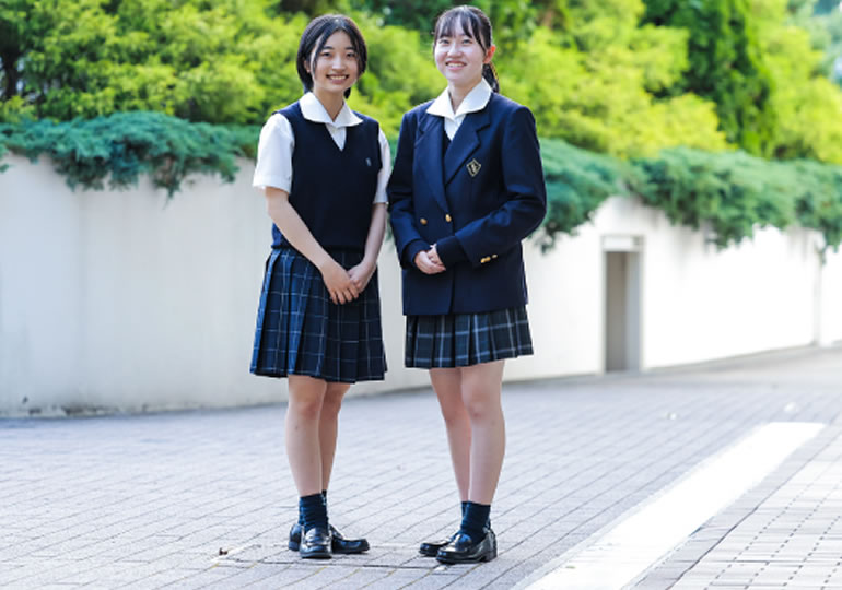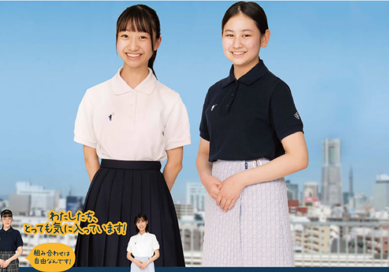 高校生はブレザーの胸エンブレムとボタンがゴールドカラー、中学生のブレザーはシルバーカラーになっています。横浜の空と海をモチーフにした明るく爽やかなデザインの制服です。1年を通して、制服の切り替え・組み合わせは自由です。季節に合わせて自由に組み合わせが楽しめます。2021年より準制服として、横浜元町の老舗ブランド フクゾーとのコラボ商品化。横浜の地元とのつながりが感じられます。