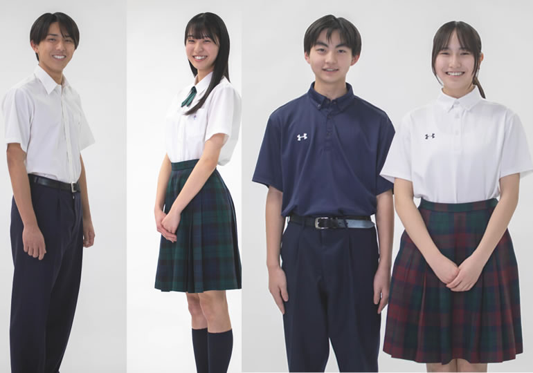 セーターとベストは紺、黒、グレーの三色を採用しています。夏服(半袖ブラウス着用) 夏服(ポロシャツ着用)