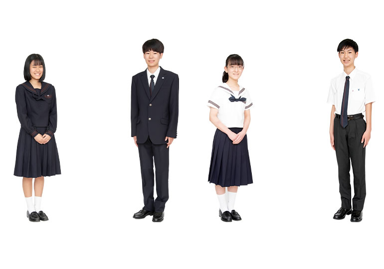 男子はブレザー、女子はセーラー服で、男女とも紺色を基調とし、アクセントにスクールカラーのえんじ色を施しています。1950年に制定された女子の制服のネクタイが共布なのは、制服をつくるときにできる端切れの共布を胸元に結んだのが始まりで、今も受け継がれるエコ精神の表れです。男子の制服は、上品で落ち着きのあるブレザースタイル。夏服のスラックスの色は、えんじ色の格子柄がさりげなく入った清新なグレイです。同じ生地で作られた女子の夏用替えスカートも好評です。ネクタイの色は男女とも中学生がえんじ、高校生が紺です。