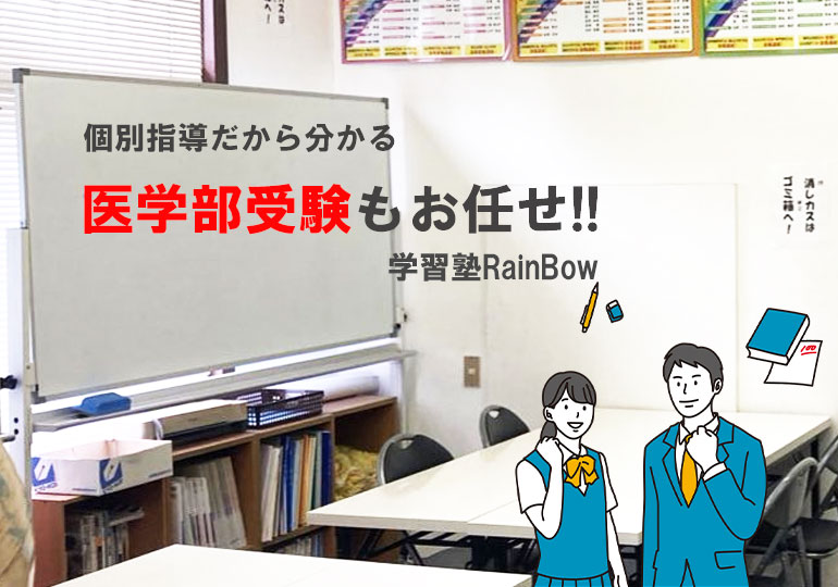 別府の学習塾RainBowは、少人数制の個別指導の塾です。 地域密着の塾で、質問がしやすいのが特徴です。理数系に強く、質問にすぐに答えてくれます。 鹿児島大学に進学した、ベテランの講師が丁寧に教えてくれます。 赤本や問題集の数は、大分の個人塾では一番!! 国立大学を目指しているご家庭には、とてもお勧めの塾です。 <<ここがポイント>> ・地域密着の塾 ・数学に強い ・大学受験にも強い ・小人数制の個別指導 ・とにかく質問がしやすい