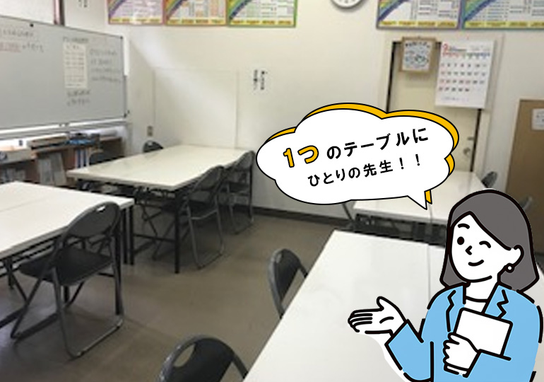 教室は4人がけのテーブル×4つで構成されています。各テーブルに先生が1人つき、しっかりと指導をします。