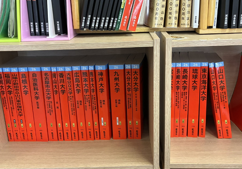赤本がたくさんあります。共通テストの対策問題集や、高校入試の問題集など、充実した書籍が自慢です。